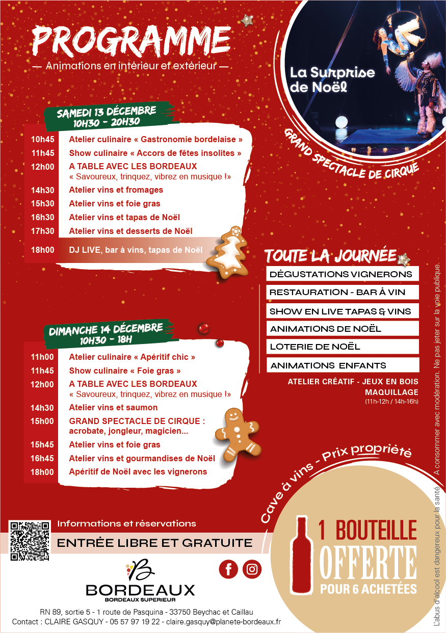 Samedi 13 et dimanche 14 décembre*, rendez-vous à Planète Bordeaux, la maison des vins des AOC Bordeaux, Bordeaux Supérieur et Crémant de Bordeaux, pour préparer vos fêtes de Noël dans une ambiance chaleureuse et festive.